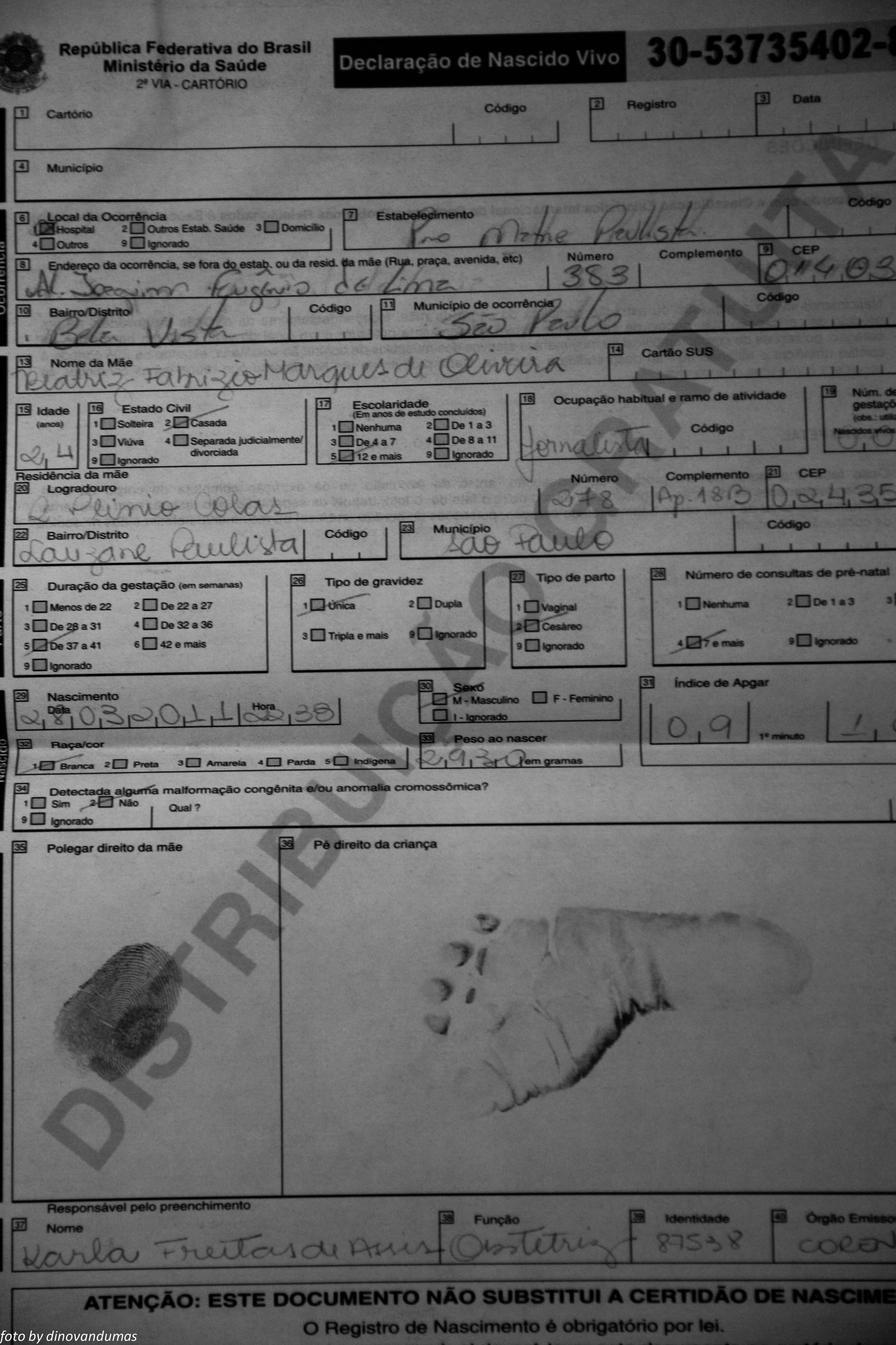 O relógio marcava vinte e duas horas e trinta e oito minutos quando eu ouvi sua voz pela primeira vez (ou melhor, o seu choro, que foi repetido por muitas e muitas noites, até você completar 06 meses, se não me engano).
